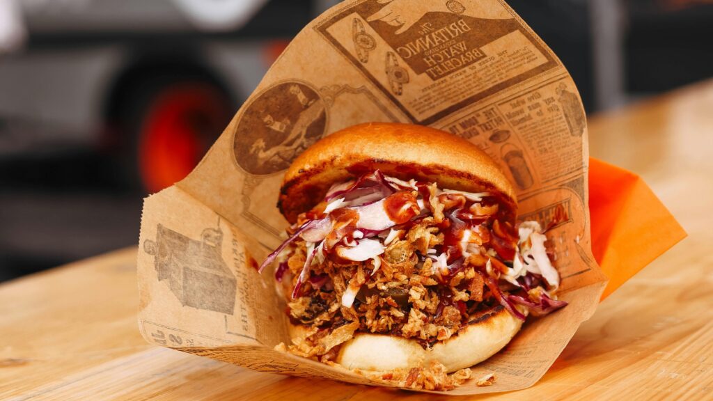 PULLED PORK BURGER (natrgana svinjina, bbq omaka, solata, zelje, paradižnik, bombeta POMFRI