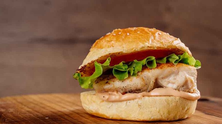 PIŠČANČJI BURGER ( ocvrt piščančji file, solata, paradižnik, sir, salsa rosa, bombeta) POMFRI